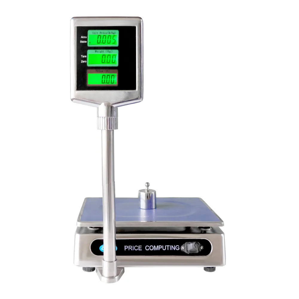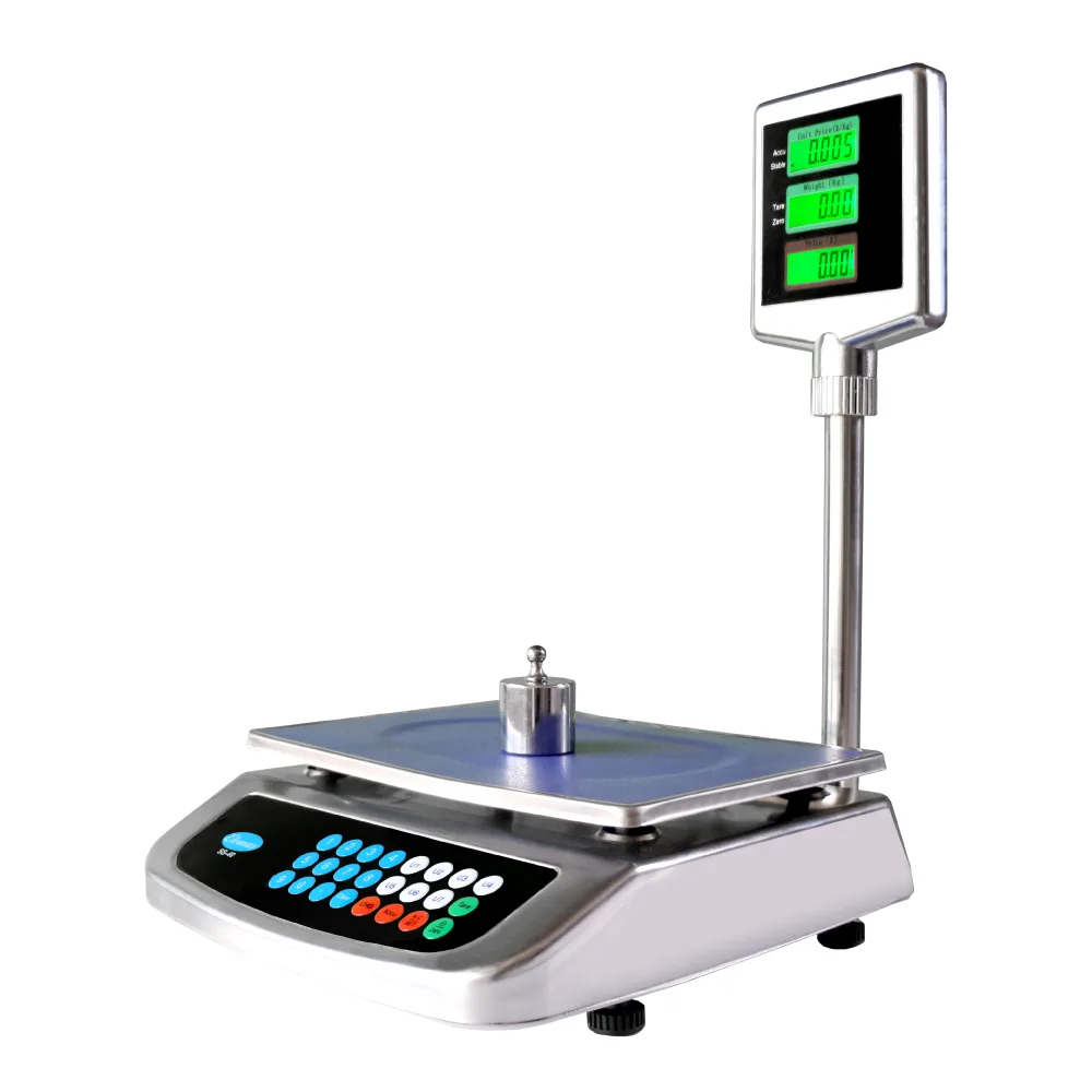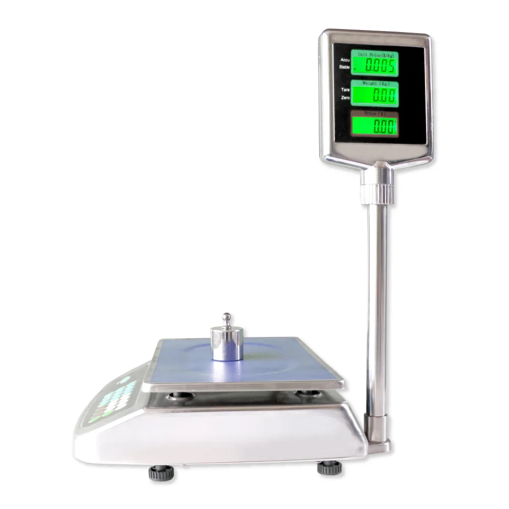 Pantalla digital LED de alto brillo con retroiluminación verde (3 visores: peso, precio unitario, importe total).