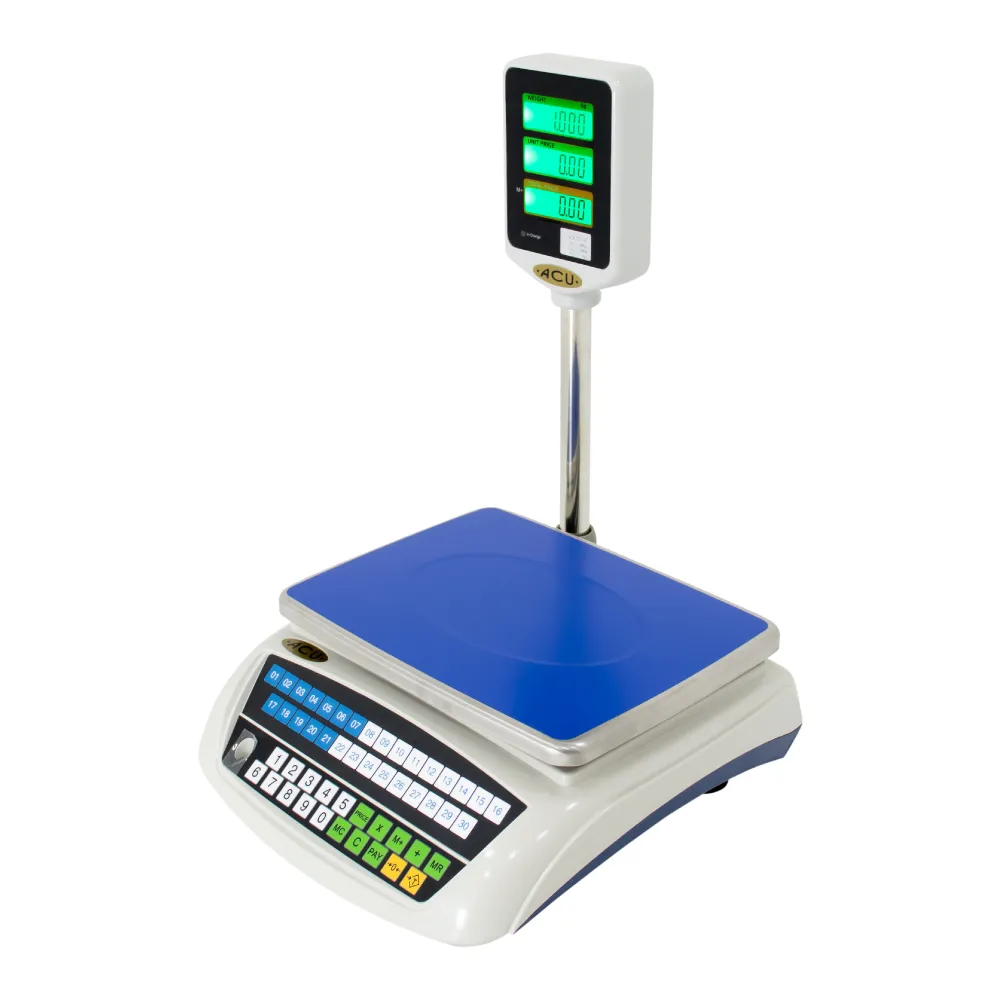 Doble pantalla delantera y posterior para fácil lectura para operador y cliente.